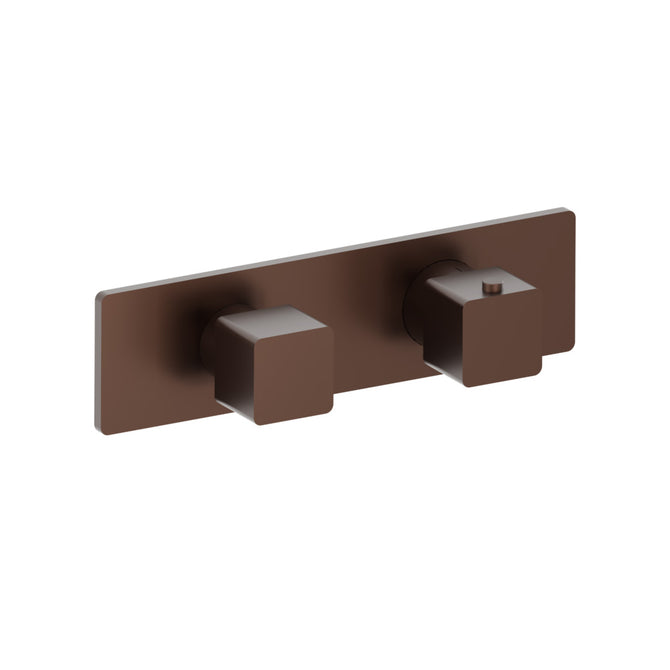 The TVH.2717F Thermostatic valve features 3/4″ NPT connections and has 2 water outputs [ports] which are operable one at a time without shared port operation. This product meets CAL-Green compliance criteria. The right handle sets the temperature. The left handle controls water diversion between the 2 water output ports. Each port has full volume control capability.