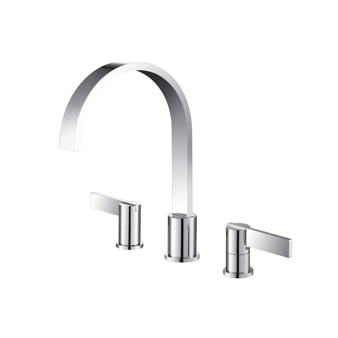 Three Hole Deck Mount Bathtub faucets have a separate hot and cold handle and are installed on the deck next to the edge of the bathtub with 3 drilled holes that are each about 4 inches apart. The faucet body and handles are all separate pieces with volume control valves concealed under the tub.