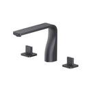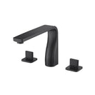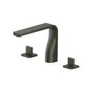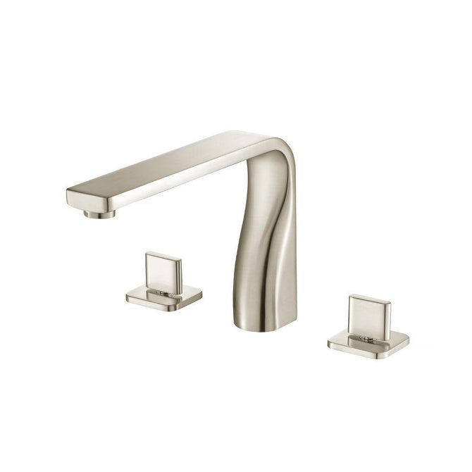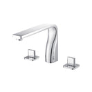 Three Hole Deck Mount Bathtub faucets have a separate hot and cold handle and are installed on the deck next to the edge of the bathtub with 3 drilled holes that are each about 4 inches apart. The faucet body and handles are all separate pieces with volume control valves concealed under the tub.