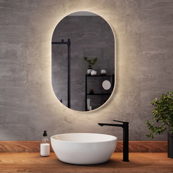 LED-illuminated oblong mirror with frosted strip, black frame and touch-switch for color temperature control.