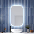 LED-illuminated oblong mirror with frosted strip, black frame and touch-switch for color temperature control.