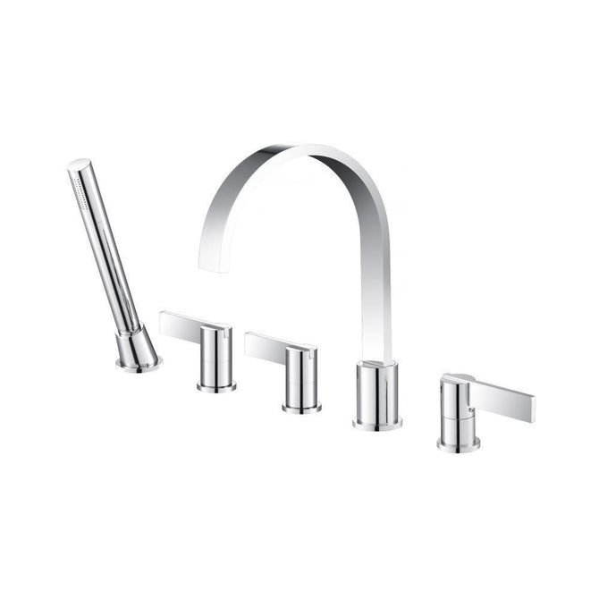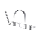 Flusso’s Five Hole Deck Mount Bathtub faucets have a separate hot and cold handle with a hand shower and hose. The deck diverter handle can be used to switch the water flow between the hand shower and tub spout. These products are installed on the deck next to the edge of the bathtub, with 5 drilled holes that are each about 4 inches apart each. The faucet body and handles are all separate pieces with valves concealed under the tub.