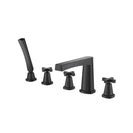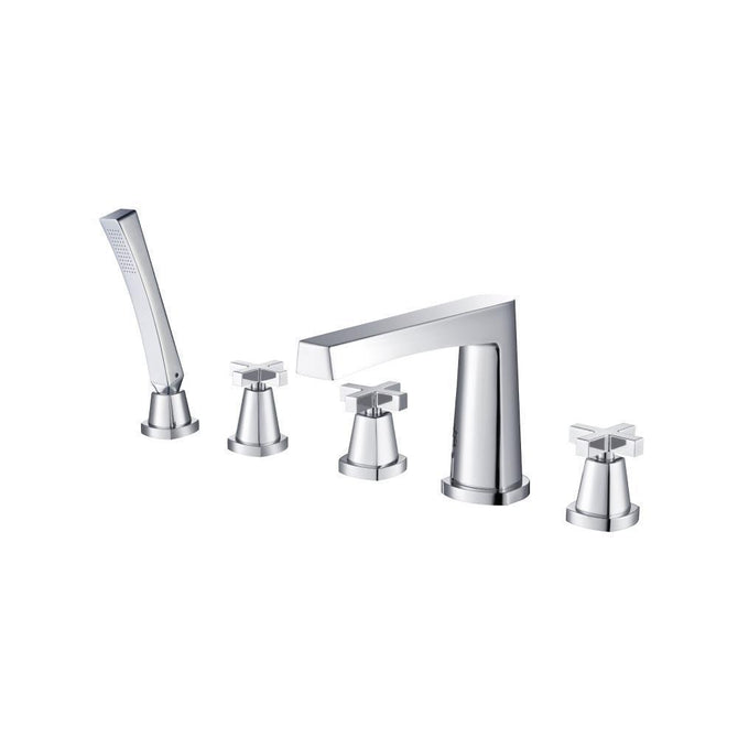Flusso’s Five Hole Deck Mount Bathtub faucets have a separate hot and cold handle with a hand shower and hose. The deck diverter handle can be used to switch the water flow between the hand shower and tub spout. These products are installed on the deck next to the edge of the bathtub, with 5 drilled holes that are each about 4 inches apart each. The faucet body and handles are all separate pieces with valves concealed under the tub.