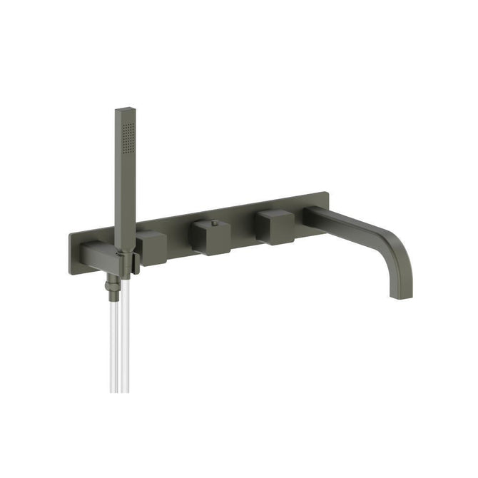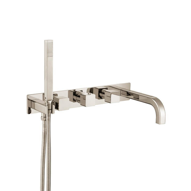 The TVH.2691 Thermostatic valve features ¾” NPT female connections and has 2 water outputs [ports] (one for the tub spout and one for the handheld). Both water outputs are operable simultaneously, i.e both at the same time, or one at a time. The middle handle sets the temperature. The left handle controls output port 1 and the right handle controls output port 2. Each port has full volume control capability. The installation of the spout and handheld shower outlets are interchangeable.