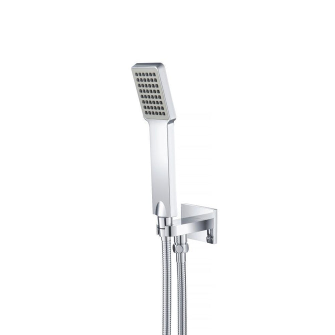 This hand held shower head set contains a single function hand shower, a metal shower hose, and a slide on water supply connector. Ideal for a renovation or new build.