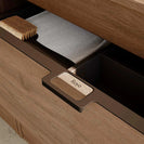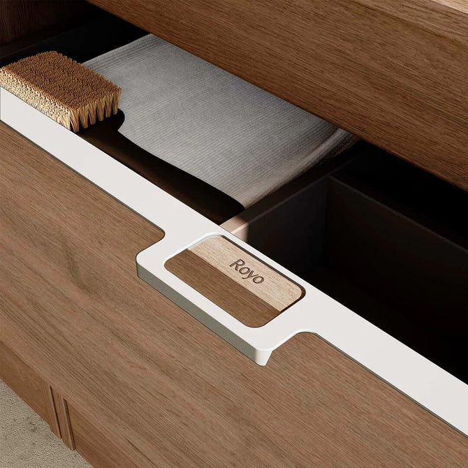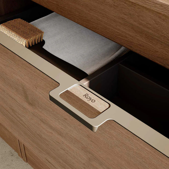 Straight lines redefine functionality in this vanity, where asymmetrical tops and a hidden handle create a sleek aesthetic. An 18-inch deep metal drawer boasts high-end looks and customizable positioning. Hettich full-extension guides ensure smooth access, while the spacious metal basket and anthracite drawer interiors complete the modern design.