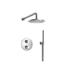The *7050 series shower set from Flusso come with a thermostatic valve and trim with a 2 output diverter, wall mount shower arm + head and handshower set with elbow / holder.